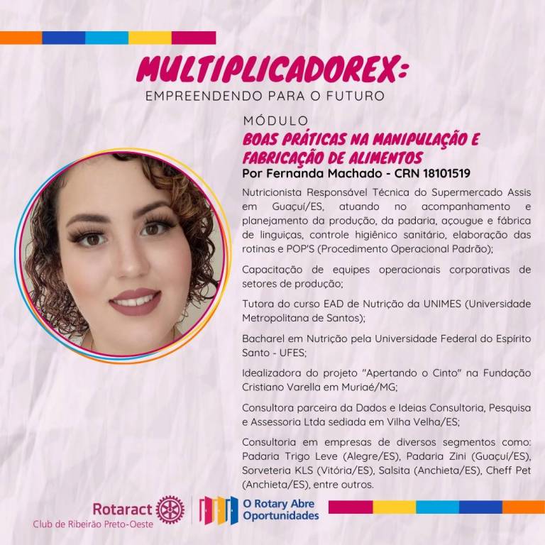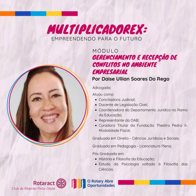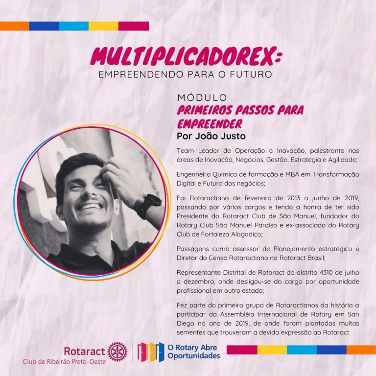 O mês de abril foi movimento no Rotaract Club de Ribeirão Preto-Oeste! O clube também realizou o projeto "MultiplicadoreX: Empreendendo para o Futuro", que consistiu em no oferecimento de um curso voltado para empreendedores ou futuros empreendedores da comunidade. Ao todo, o curso teve nove aulas, dos mais variados temas - mas é claro, todos voltados para o empreendedorismo - além de duas palestras bônus, sendo que o curso todo foi realizado entre os dias 05/04 a 25/04.